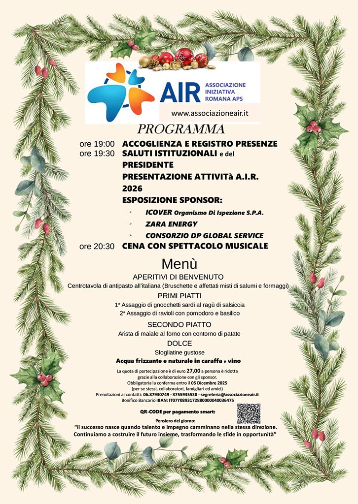 la nuova AIR – Associazione Iniziativa Romana APS, da quest’anno, amplia il proprio impegno rivolgendosi anche al settore sociale, oltre a continuare a fornire supporto e consulenza qualificata agli Associati appartenenti alle tre categorie rappresentate: Amministratori di Condominio, Imprese e Artigiani, Professionisti del Settore Immobiliare.